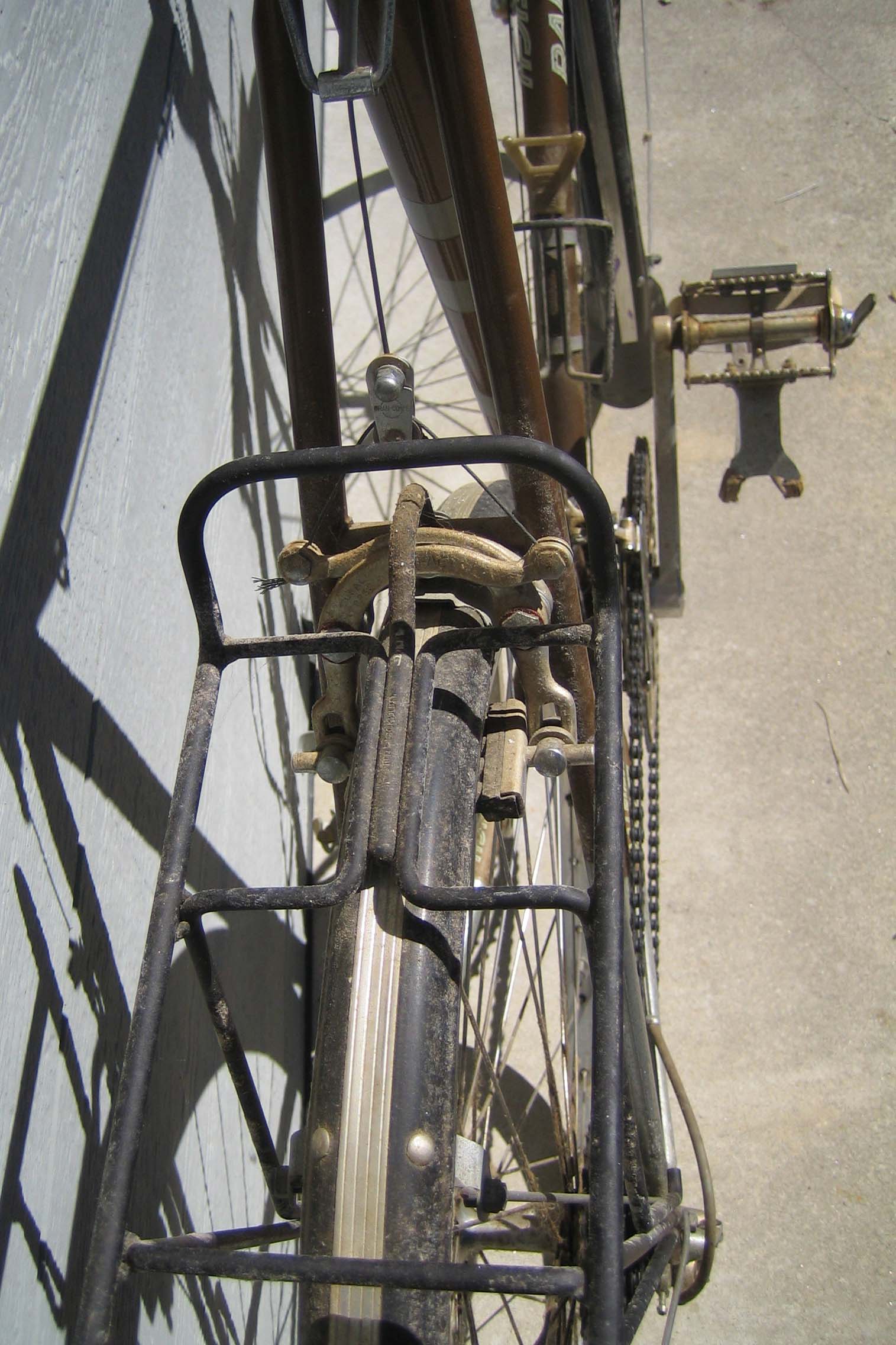 Last summer I pulled this bike out of the basement, stripped it down to the bare frame, and then cleaned, polished, and lubricated every part. I sold the heavy-duty Blackburn racks, replacing the rear one with an even older rack from another bike (see below). I found the small brake levers and six-speed Sun Tour bar end shifters still in their original packaging and finally installed them. New tires, tubes, rim strips, cables, cable housings, and brake pads finished off the rebuild.