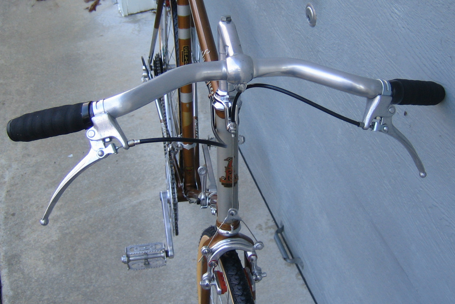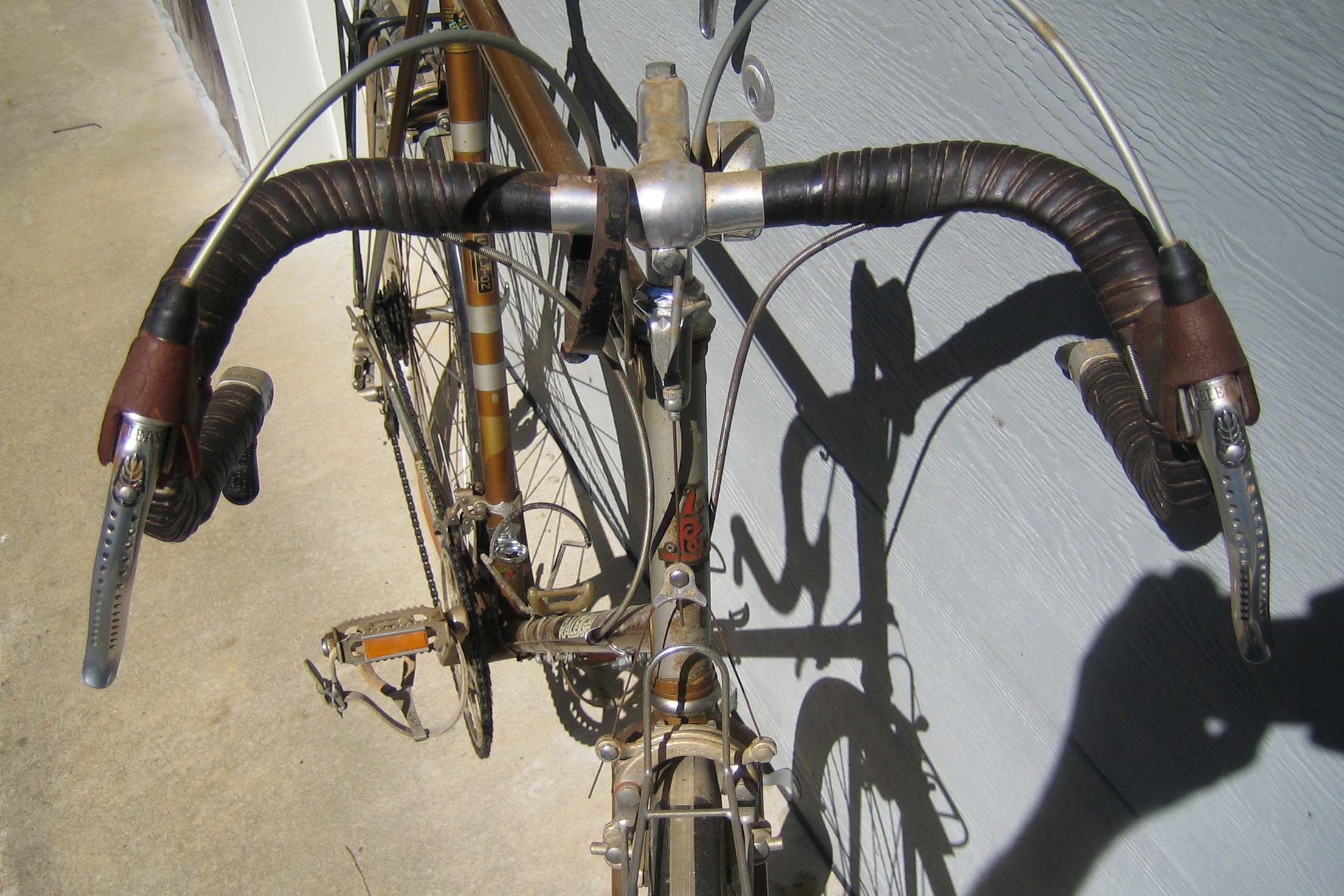 The handlebar is a rare GB tourist bend that I found in a Cambridge bike shop in 1970. It is characterized by a shallow drop and angled ends. I originally set it up with Huret Randonneur brake levers, which I quickly came to despise. I also disliked the down tube shifters. I bought a pair of brake levers designed for small hands that fit the tight handlebar bend, and a set of Sun Tour 6-speed bar end shifters, but did not install them at the time.