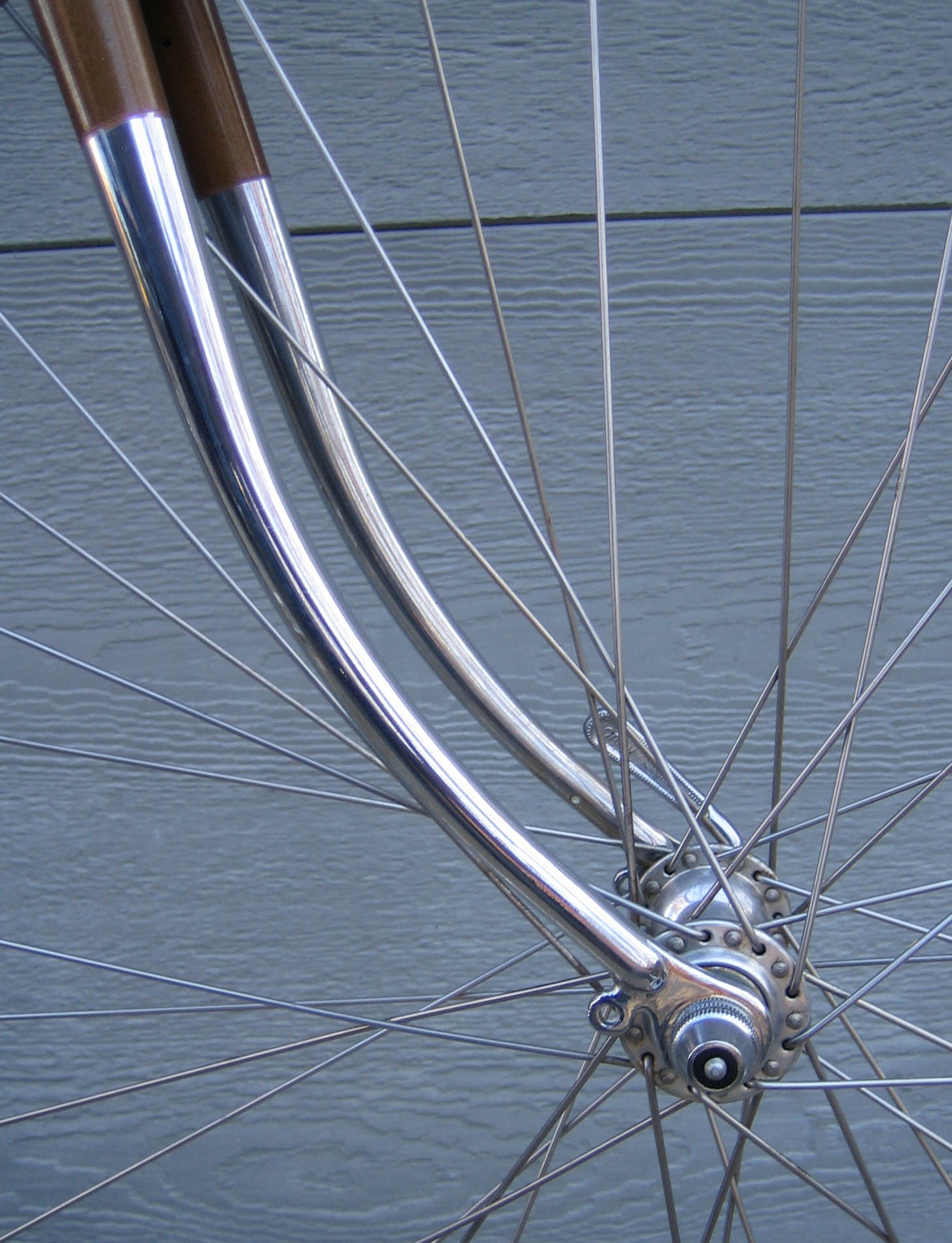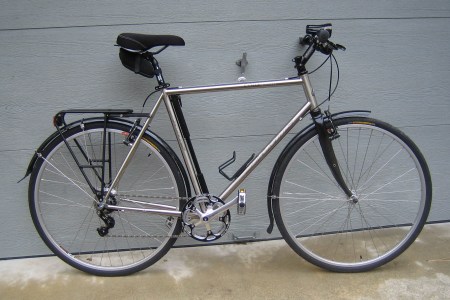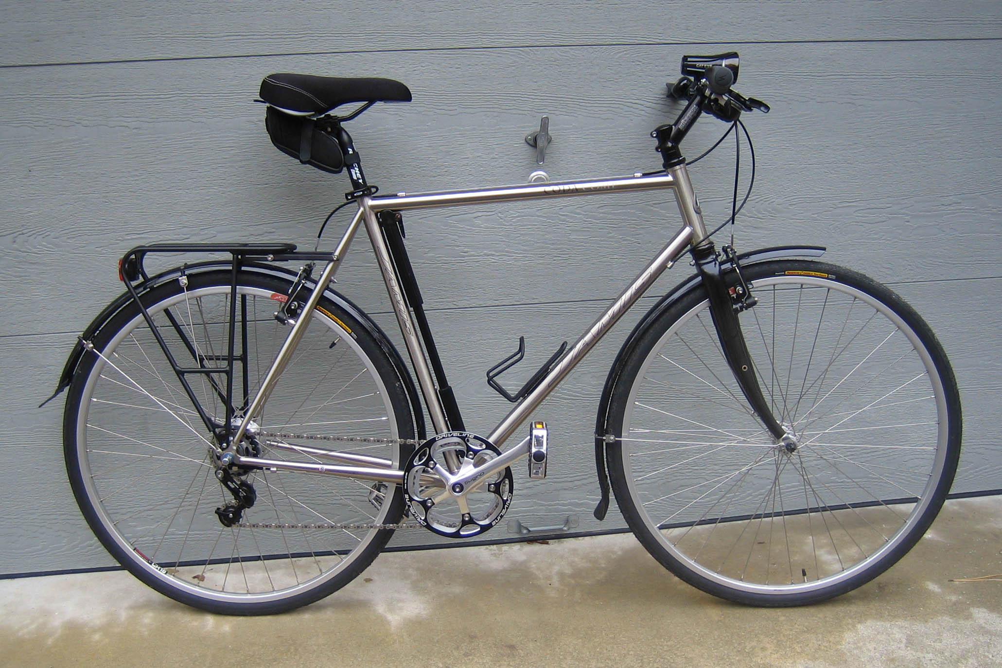 I kept only the frame, fork, handlebar, seat, and brakes. Everything else went to eBay, where it sold for $99. I then invested more than $1200 in new components. These included more robust wheels, wider (32mm) tires, Sugino cranks and bottom bracket, Civia mudguards and rack, LED lights, and the Shimano Alfine 8-speed hub, shifter, and chain tensioner.