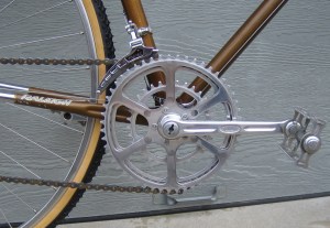 I completely disassembled the bike and spent more than 25 hours cleaning, polishing, and lubricating every part. I removed and sold the GB handlebar, Sun Tour bar end shifters, and TA front rack, raising enough income to pay for new tires, tubes, cables, brake pads, and levers. The Kool Stop salmon brake pads molded in the characteristic style of the Mafac pads they replaced came from Velo Orange. VO also sold me the brand new old stock C.L.B. City brake levers. This bike cleaned up remarkably well despite its age and almost looks like new.