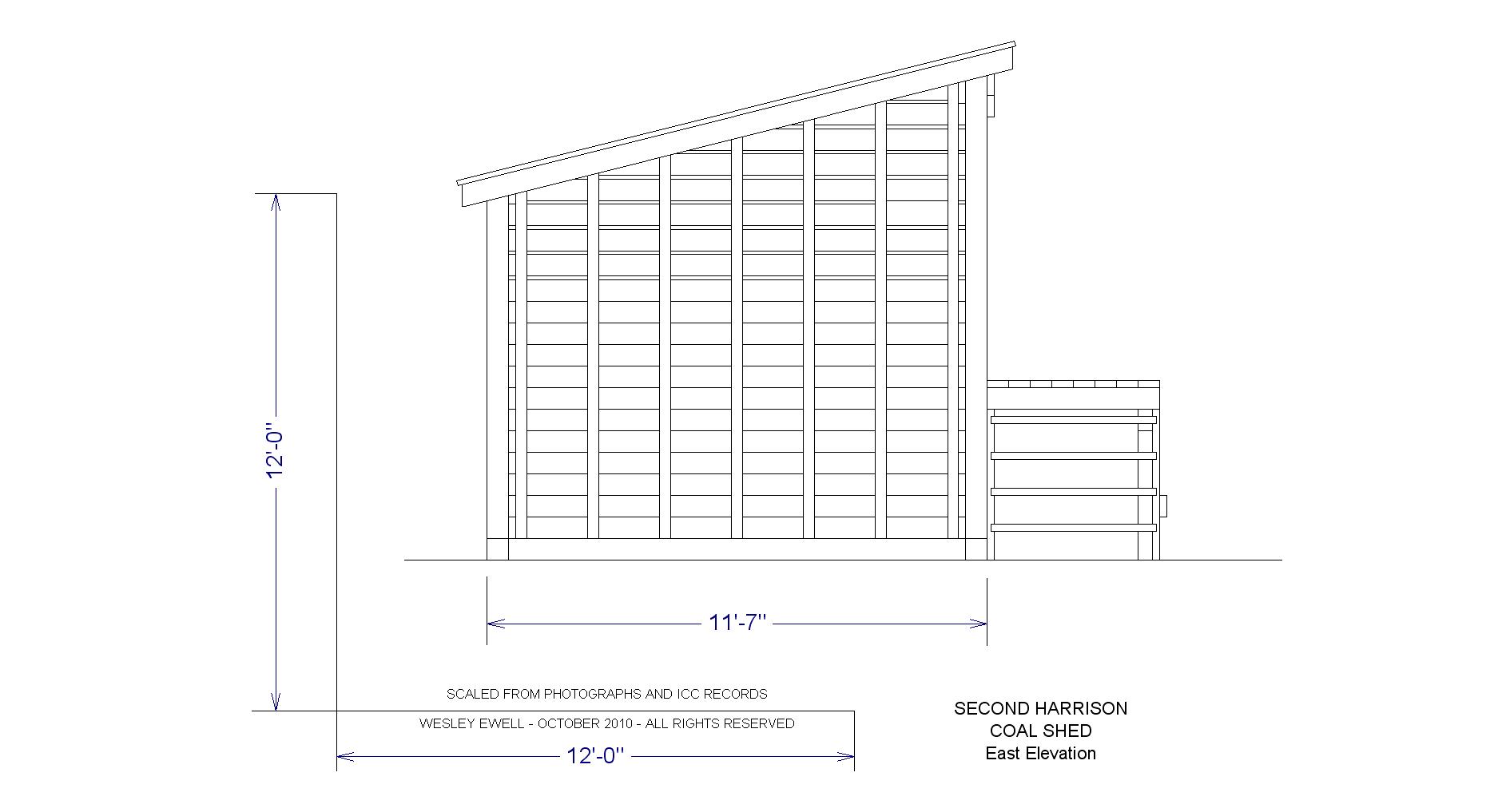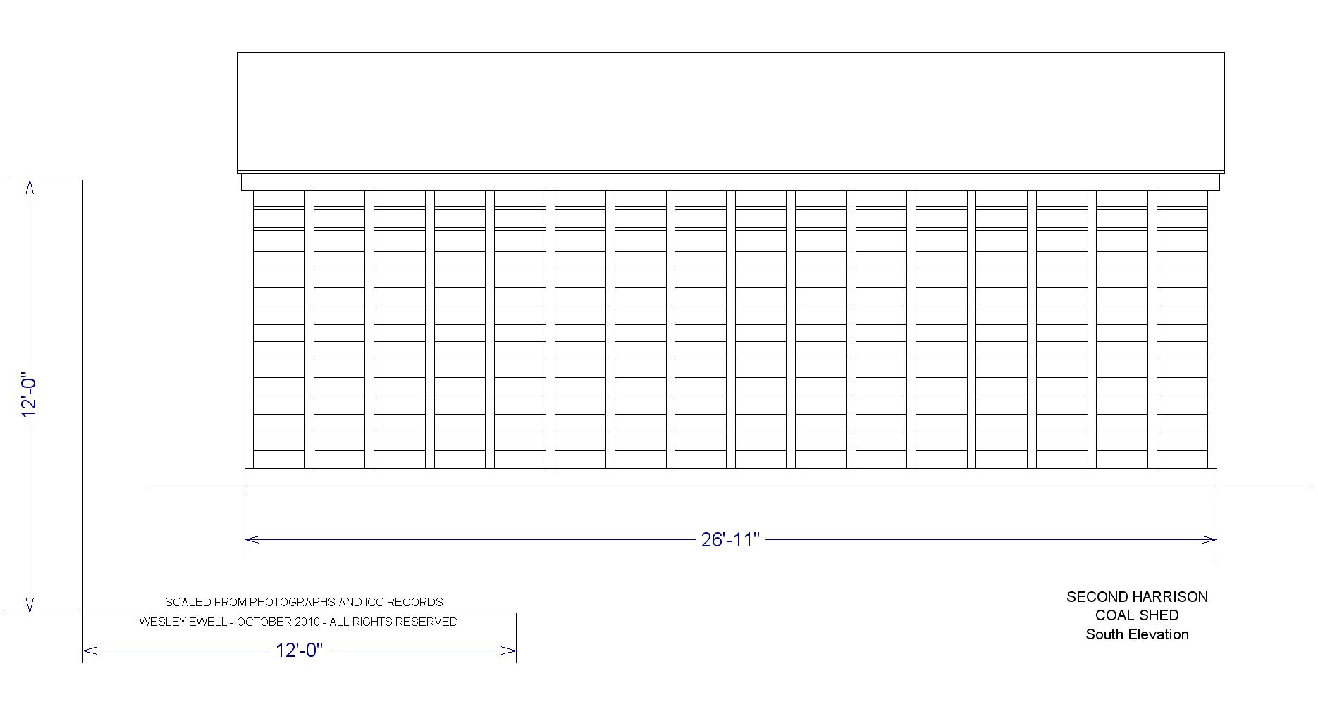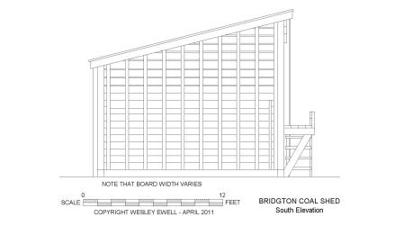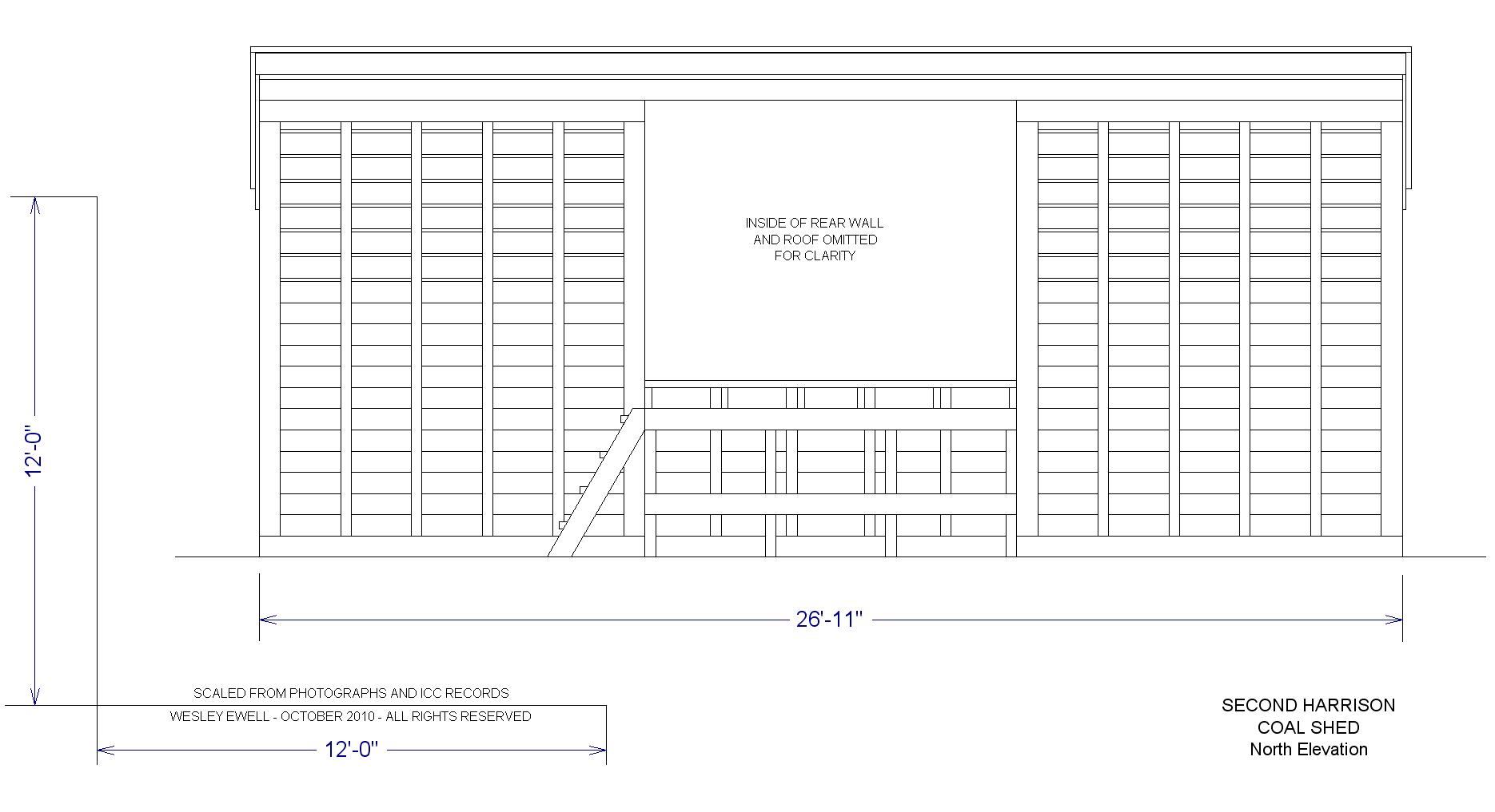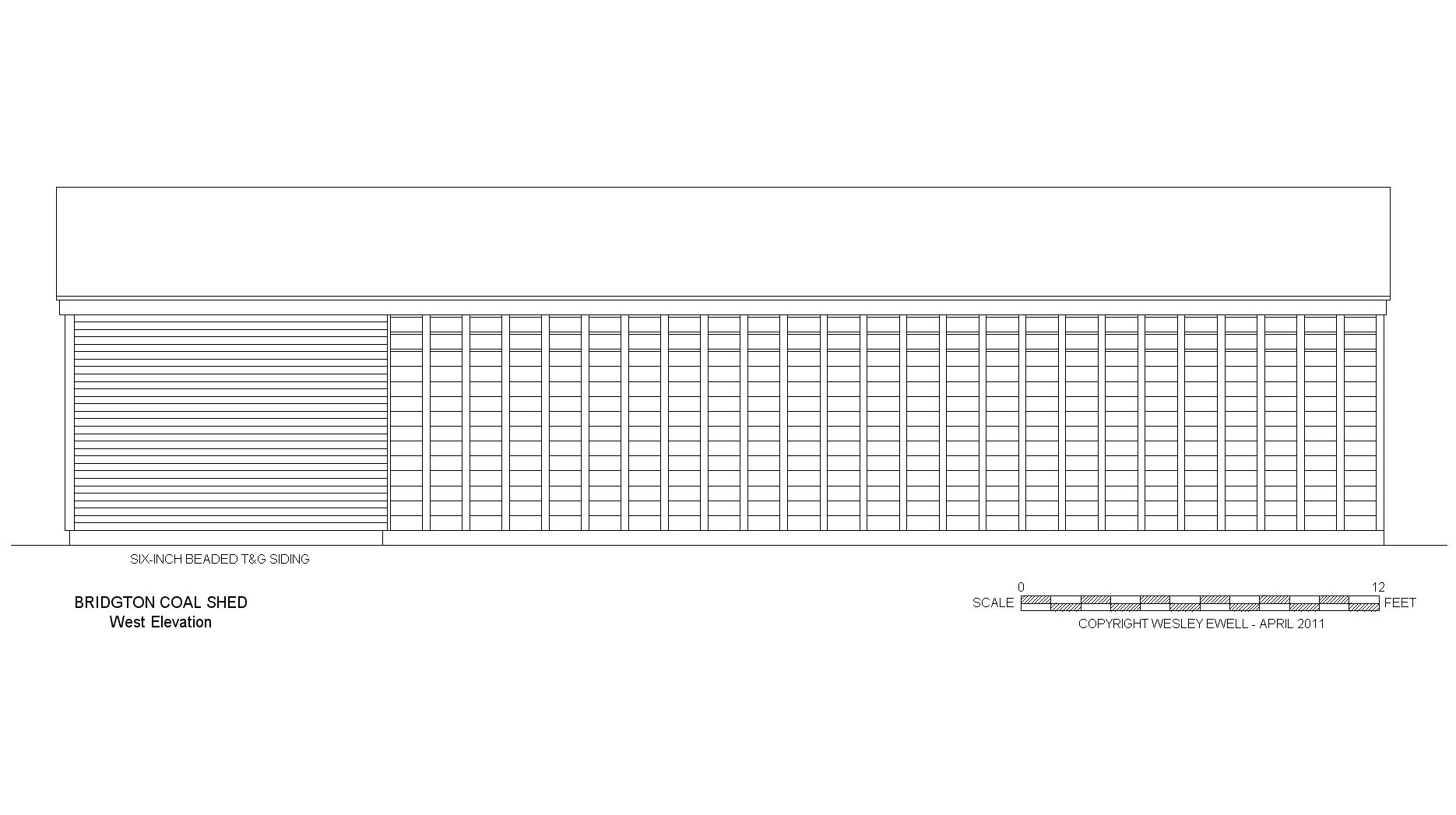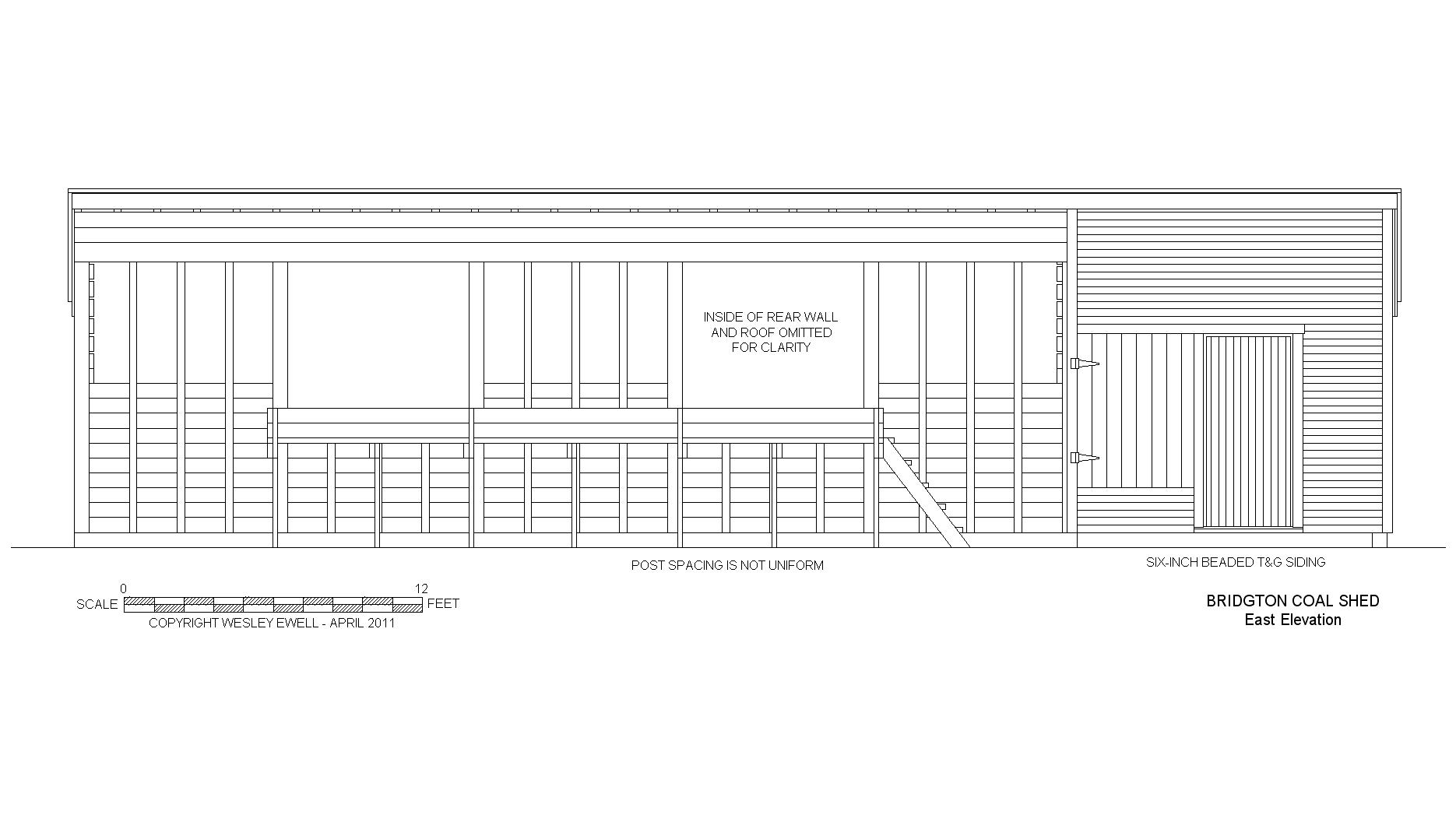 Terry Smith asked me to draw up the coal sheds used by the Bridgton & Saco River Railroad to service their locomotives in Bridgton and Harrison, Maine. There was plenty of information available for the Bridgton structure, including overall dimensions from the 1916 ICC report and many photographs. Here’s what I came up with for that shed. Left click on the drawings to enlarge them to full screen. Note that this building appears to be deeper in many of the published photographs. After struggling with this problem for a while, I finally determined that those photos distorted the building. This is a common problem with photos taken with a large glass lens that stretches items located toward the edges of the photos.
