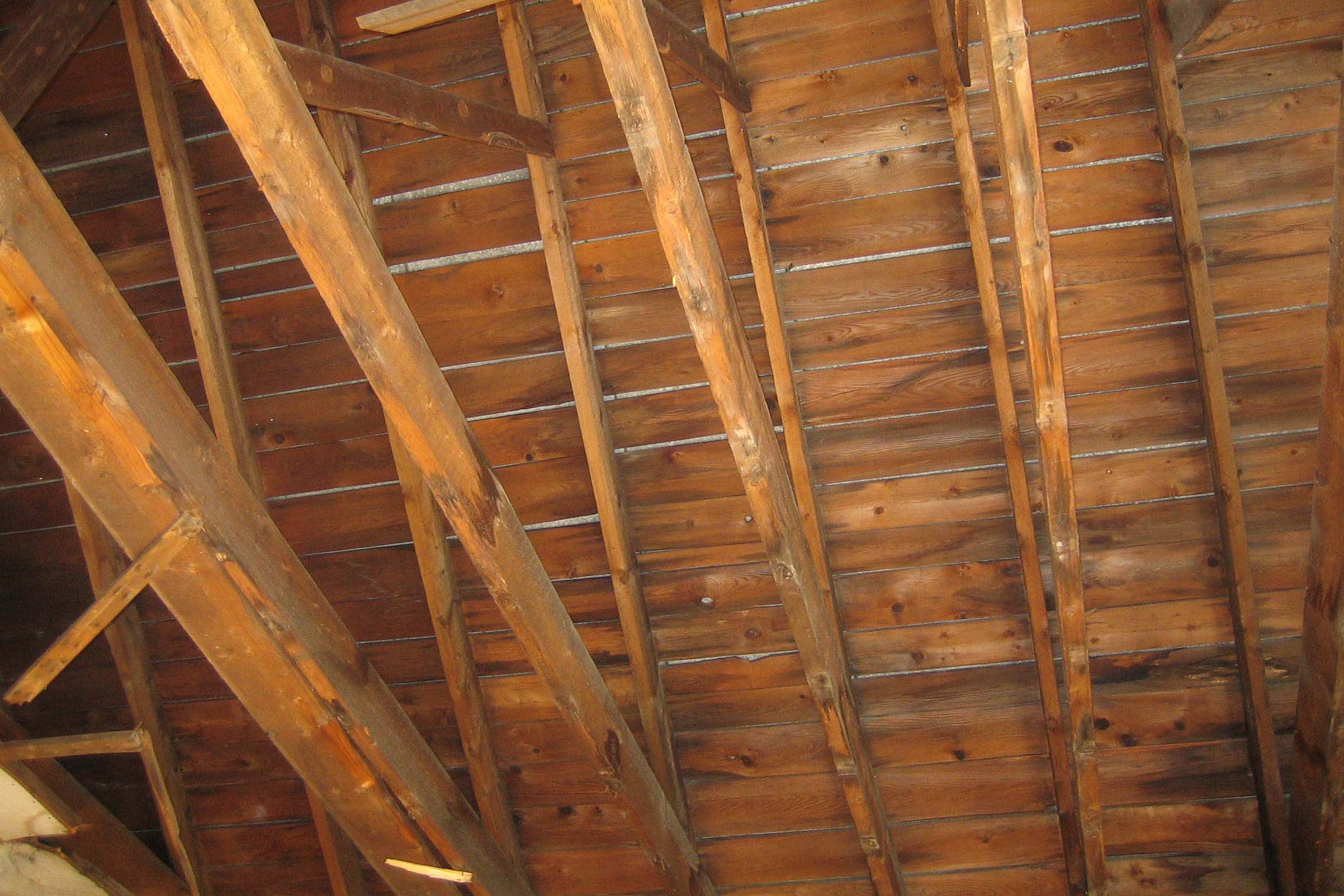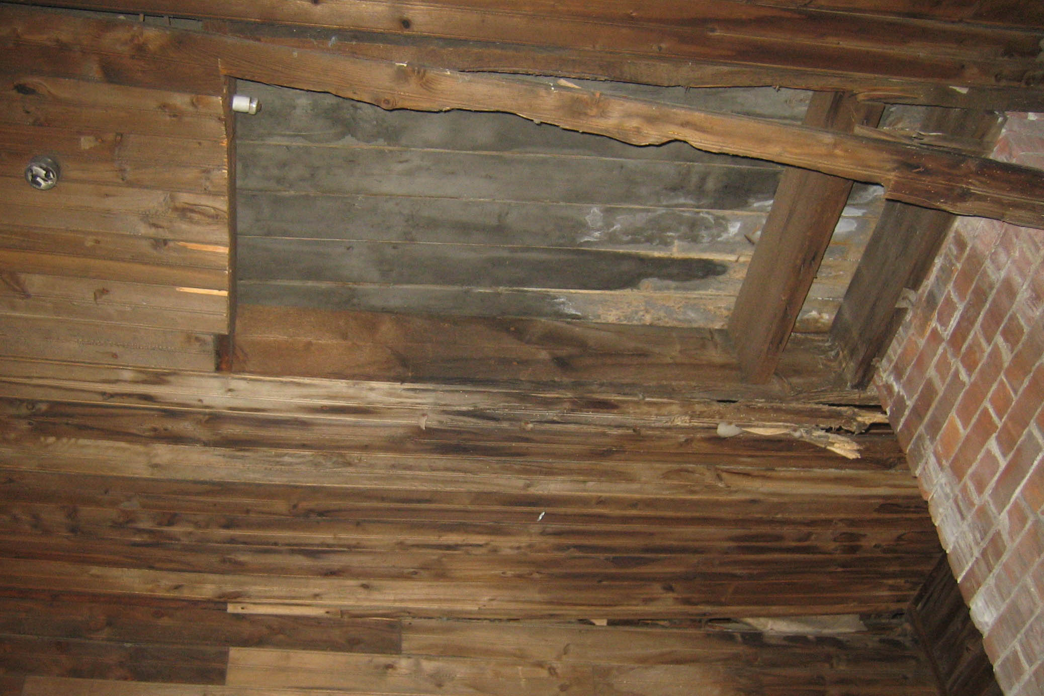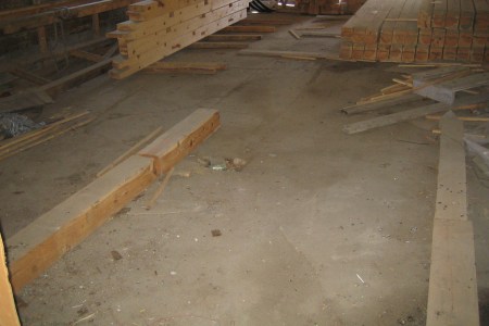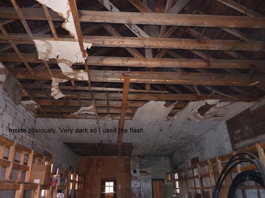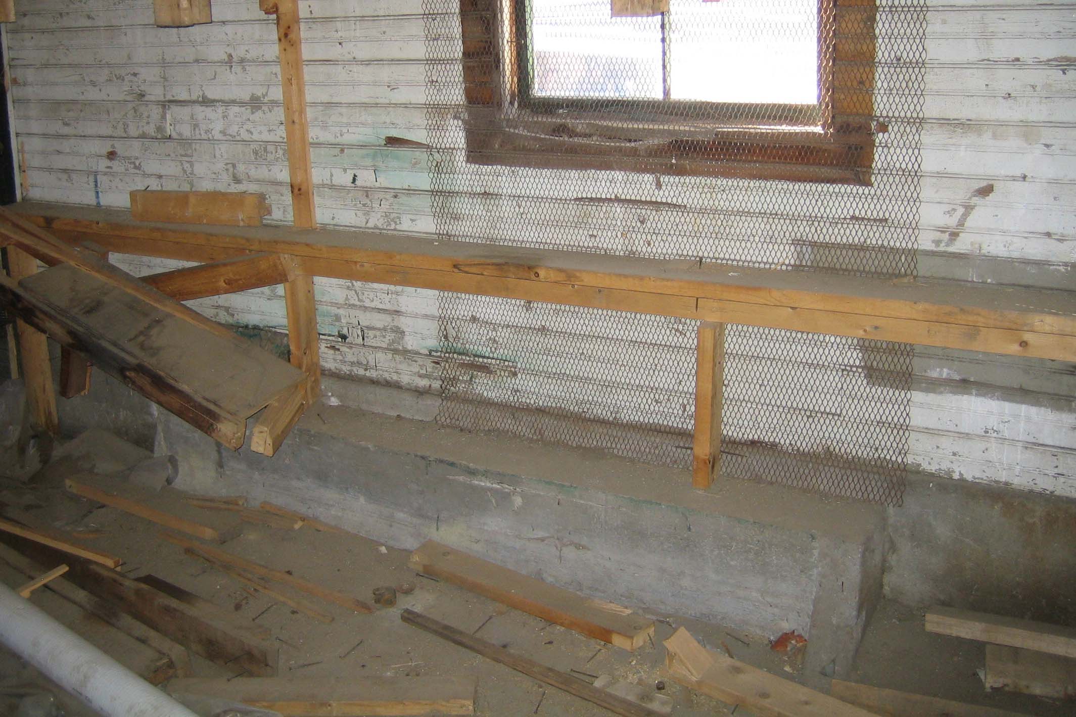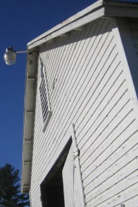 The creamery’s structure was very advanced for the time it was built and has stood up well for a century. It is framed with full-dimension 2″x4″ studs on 24″ centers, with similarly lightly-framed roof trusses, as shown in this interior view that Neil shot and annotated in October 2009.