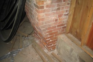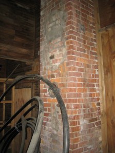 The chimney shows a pipe hole for a coal stove in the office area. The stack slopes inward below what would have been the raised office floor.