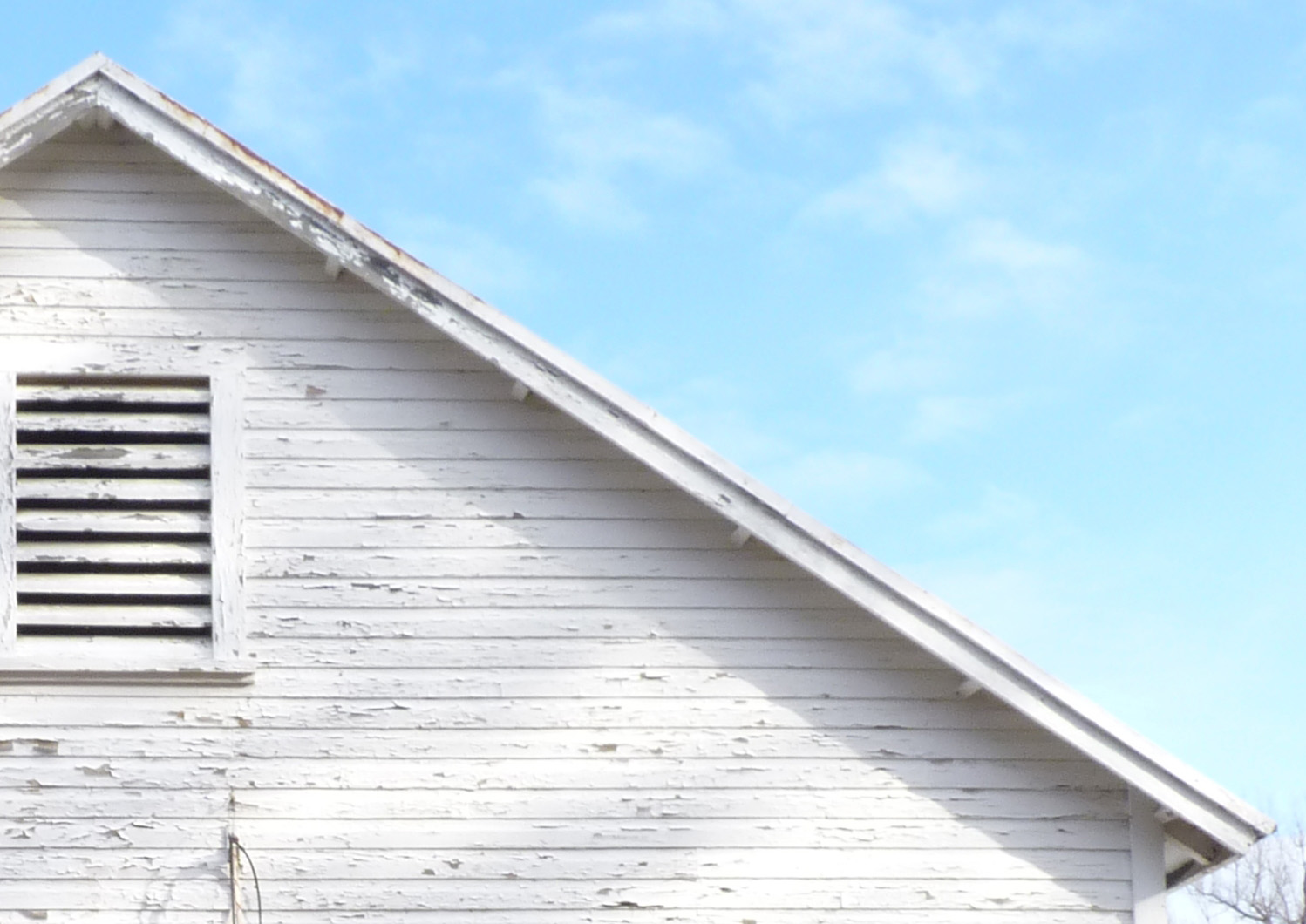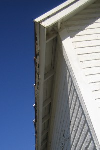 Postscript: Gerry Cole asked me about the rafter ends, which don’t show on the drawings. Here is a shot from one of Neil’s photographs showing exposed rafter tails that appear to be about 2″ x 4″. Similar pieces block out the gable trim in the ends. Here are two more photos that I took in August 2010 showing the under eave framing.