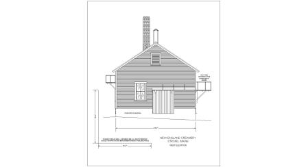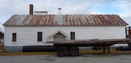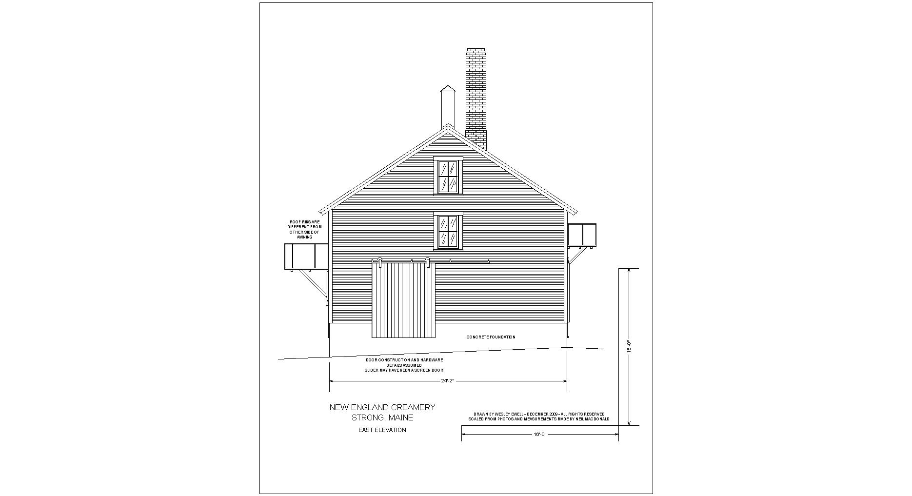 At the request of several narrow gauge railfans, I have created a set of drawings of this building. This process was made easier because the building still exists. One of those railfans, Neil MacDonald, lives in Maine and offered to photograph and measure the creamery. Neil also got inside the building, which was enormously helpful to me because his photos showed the structure and interior layout. Here is how the north side looked when Neil photographed it in June 2007.