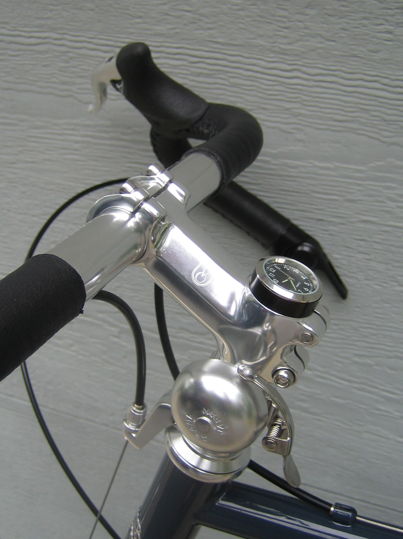 Uncluttered BarI also want to reduce the clutter on the bar, so ordered a bell that’s mounted on a head tube spacer, a headlight that mounts to the fork, and a gorgeous octagonal stem from VO, along with their elk hide leather bar cover and a stem head clock. Here’s what it looked like before and after. The headlight is now stowed in my rack bag, since it only takes a minute or so to mount and I rarely need it. The stemhead clock is terrific. I can even read it without glasses.Clutter Bar 2